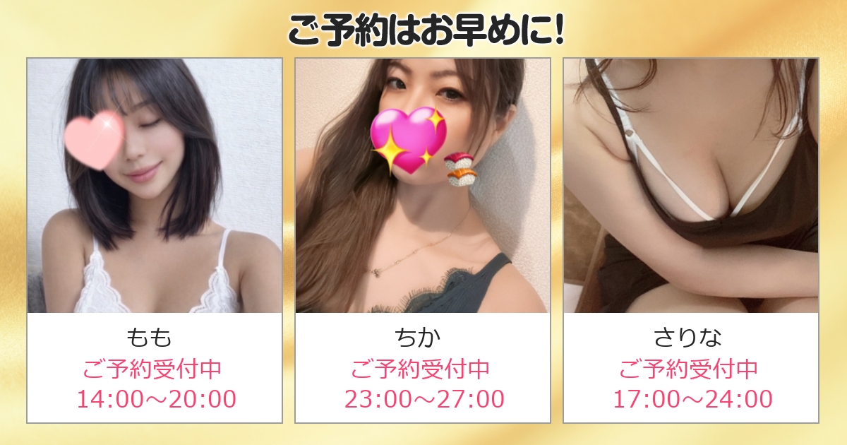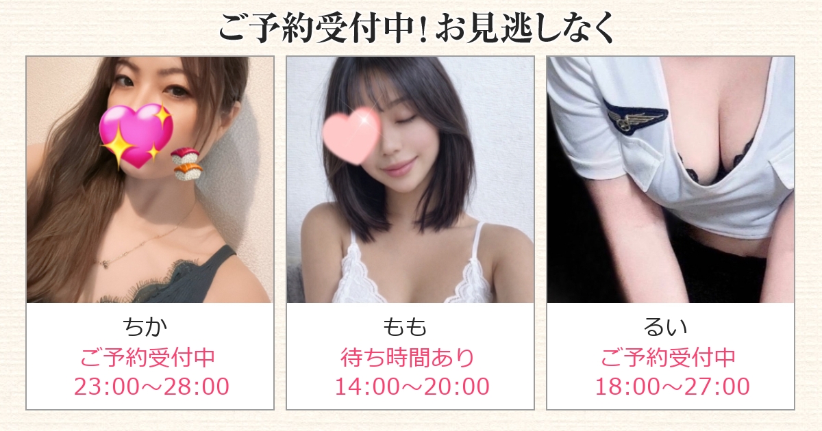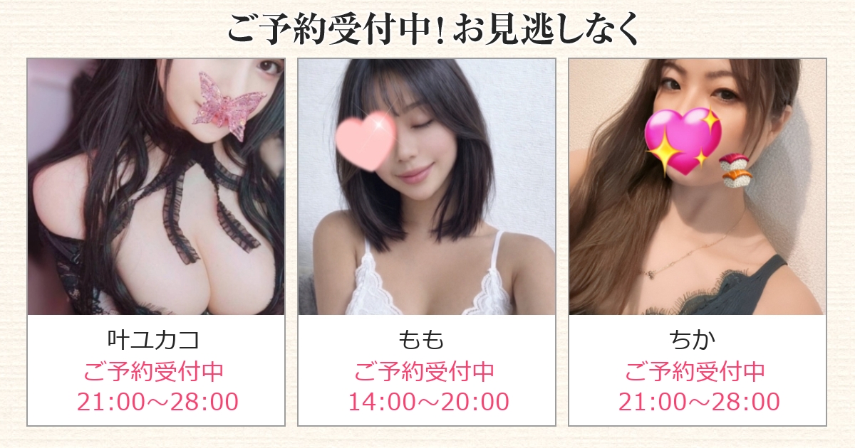 夜はこちら。 ■叶ユカコ 21:00〜28:00 ■ちか 21:00〜28:00 夜に楽しむのも良いですが、 どうしても予約は集中しやすい時間帯。
